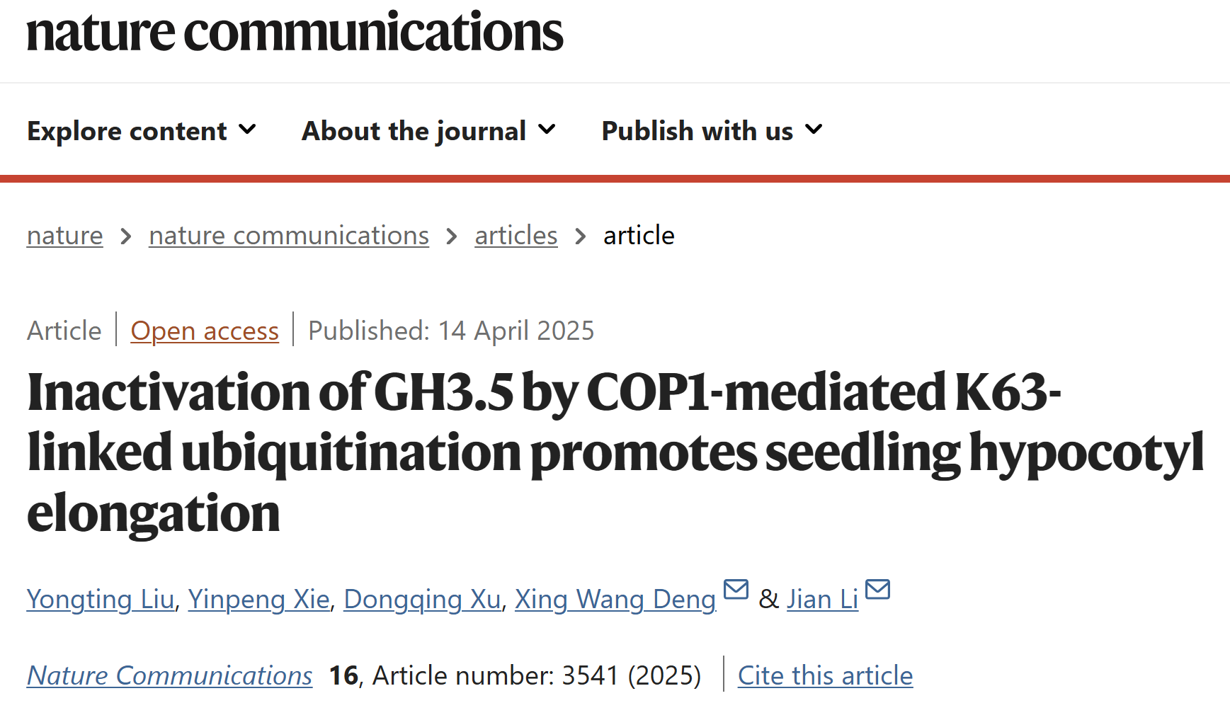光控形态建成对于幼苗的出土存活及营养方式转变等至关重要。30多年的研究确立了泛素连接酶COP1(CONSTITUTIVELY PHOTOMORPHOGENIC 1)介导的蛋白降解在调控幼苗光形态建成中的核心作用。近期永利集团88304官网、北京大学现代农业研究院邓兴旺团队与南京师范大学生命科学学院李健团队合作,发现黑暗中COP1可以通过K63泛素化抑制生长素酰胺合酶GH3.5的酶活,从而促进拟南芥幼苗下胚轴伸长。这项题为“Inactivation of GH3.5 by COP1-mediated K63-linked ubiquitination promotes seedling hypocotyl elongation”的研究成果于2025年4月14日在线发表于国际著名学术期刊Nature Communications。