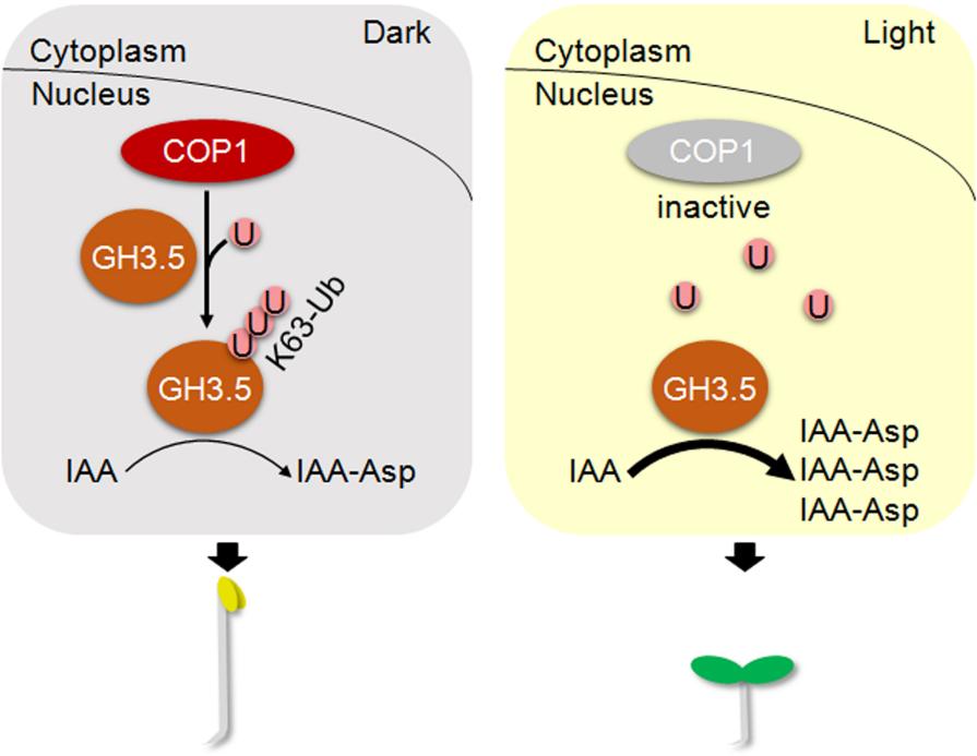 本研究首先通过遗传学和生物化学实验发现COP1在拟南芥体内参与K63泛素链的形成。接着,为筛选COP1介导的K63泛素化的底物,利用IP-MS技术设计了两套蛋白鉴定实验:一方面利用能特异结合K63泛素链的K63 TUBE(K63 TANDEM UBIQUITIN BINDING ENTITY)琼脂糖凝珠从拟南芥体内富集并鉴定K63泛素化依赖于COP1的蛋白;另一方面利用常规的IP-MS鉴定COP1的互作蛋白。据此,研究团队鉴定到GH3.5可能是COP1 K63泛素化的底物。GH3.5属于生长素酰胺合成酶家族,能够催化IAA与天冬氨酸(Asp)共价连接成IAA-Asp,从而失活IAA,抑制下胚轴伸长。本研究证实COP1能够对GH3.5进行K63泛素化修饰,进一步发现COP1介导的K63泛素化不影响GH3.5的蛋白稳定性,却显著抑制GH3.5的酶活,从而抑制IAA-Asp的生成、维持IAA的活性,最终促进下胚轴伸长。光信号可以逆转COP1介导的GH3.5酶活抑制,促进IAA催化为IAA-Asp,从而失活IAA、抑制下胚轴伸长(图1)。综上,该工作发掘了COP1介导的泛素化修饰调控蛋白降解之外的新功能,揭示了光信号调控生长素活性的分子机制,为光控生长素代谢调节植物形态建成的研究提供了新视角。