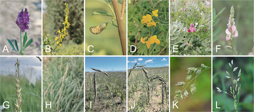 A) 紫花苜蓿(Medicago sativa)B) 黄花草木樨(Melilotus officinalis)C) 普通田菁(Sesbania cannabina)D) 百脉根(Lotus corniculatus)E) 箭筈豌豆(Vicia sativa)F) 红豆草(Onobrychis viciifolia)G) 羊草(Leymus chinensis)H)多年生黑麦草(Lolium perenne)I) 披碱草(Elymus dahuricus)J) 老芒麦(Elymus sibiricus)K) 鸭茅(Dactylis glomerata)L)一年生早熟禾(Poa annua)